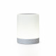 Caixa de som multimídia com luzes. Material plástico resistente na cor branca fosca, parte superior com falante e sensor touch para troca de luzes. Parte inferior branca leitosa, base com EVA antideslizante e alça de alumínio para transporte. A caixinha executa nos modos Bluetooth, rádio FM, auxiliar e cartão TF (MicroSD). Acompanha cabo USB e cabo Auxiliar (P2).