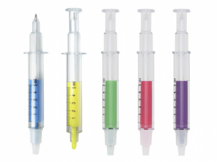 Obs.: Caneta plástica em formato de seringa, esferográfica e marca texto. Possui medidor imitando uma seringa e tampa protetora nas duas pontas.