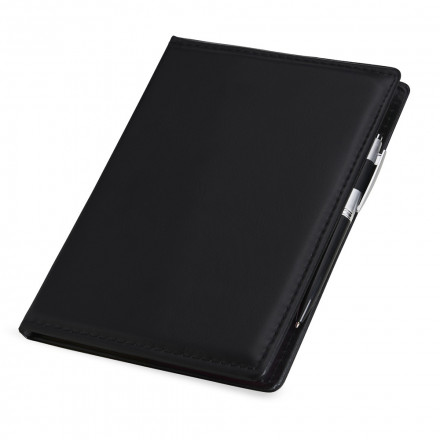 Obs.: Kit para anotações em couro sintético com autoadesivos e caneta plástica. Contém seis blocos com aproximadamente 50 folhas, conjunto de cinco marcadores plásticos autoadesivos com aproximadamente 26 folhas, bloco A5 com aproximadamente 50 folhas e caneta esferográfica com carga azul e acionamento por clique.
