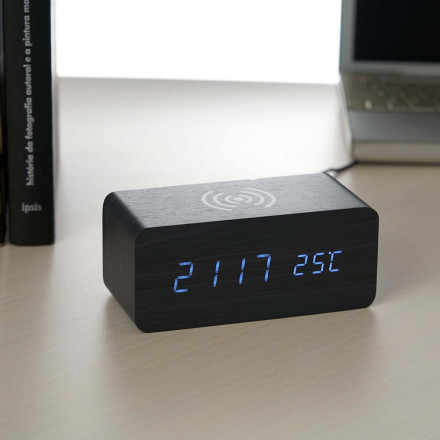 Obs.: Relógio digital LED com alarme e carregamento por indução, pode ser utilizado através da fonte USB (acompanha) ou 3 pilhas AAA (não acompanha). Produzido em MDF, o relógio possui um display LED na parte frontal, área para carregamento via indução na parte superior, parte traseira com mecanismo para ajustes, entrada DC 5V e compartimento de pilhas.